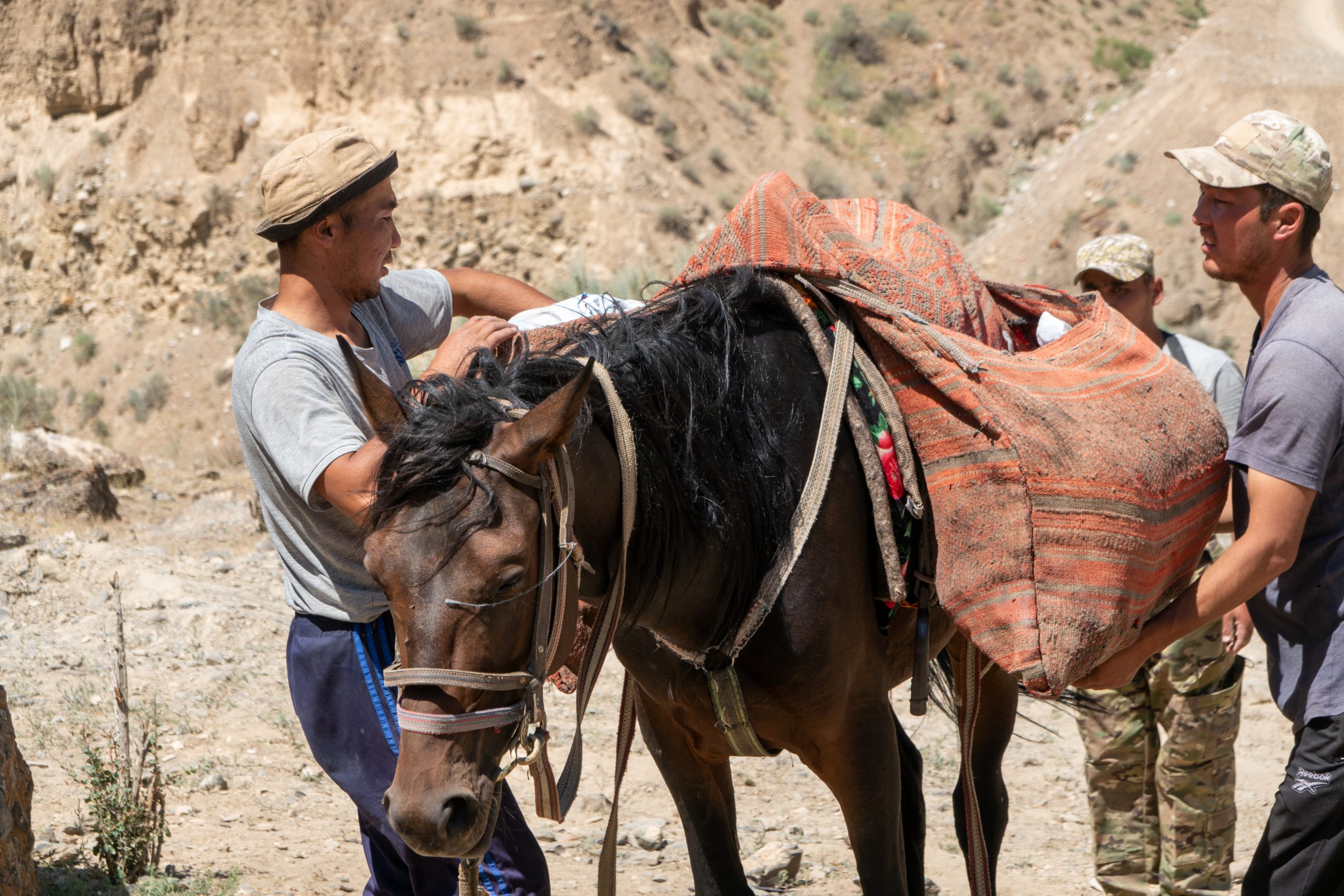• At 10:00am, our horses came. The loading of the horses took a long time (30 min per horse). Each horse carries a maximum of 60 kg and the bags must be balanced exactly on both sides.