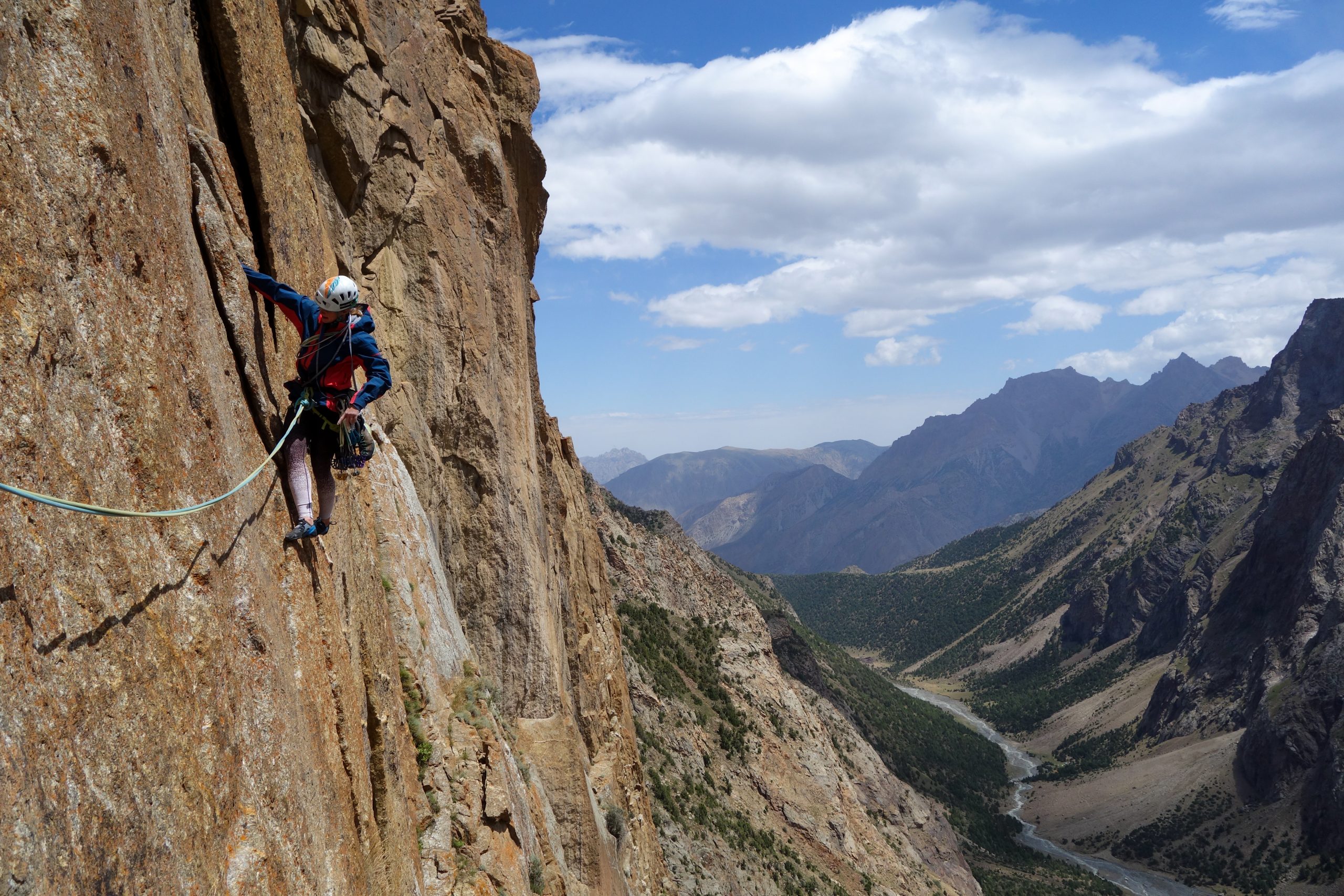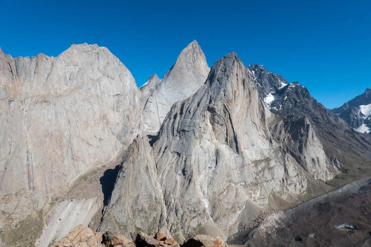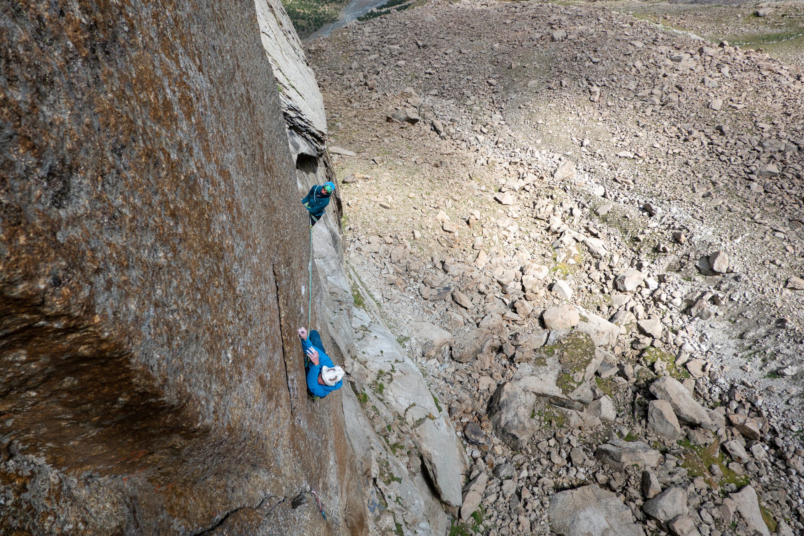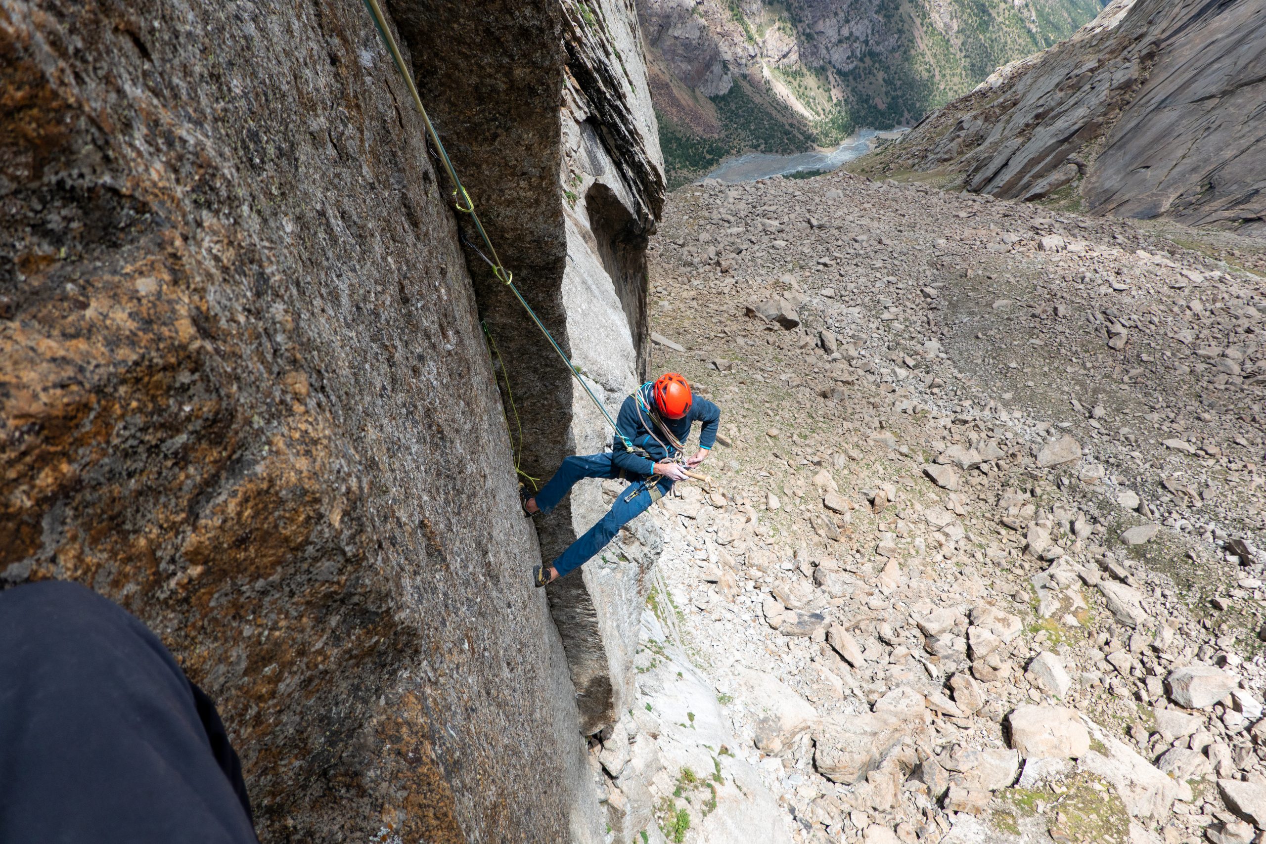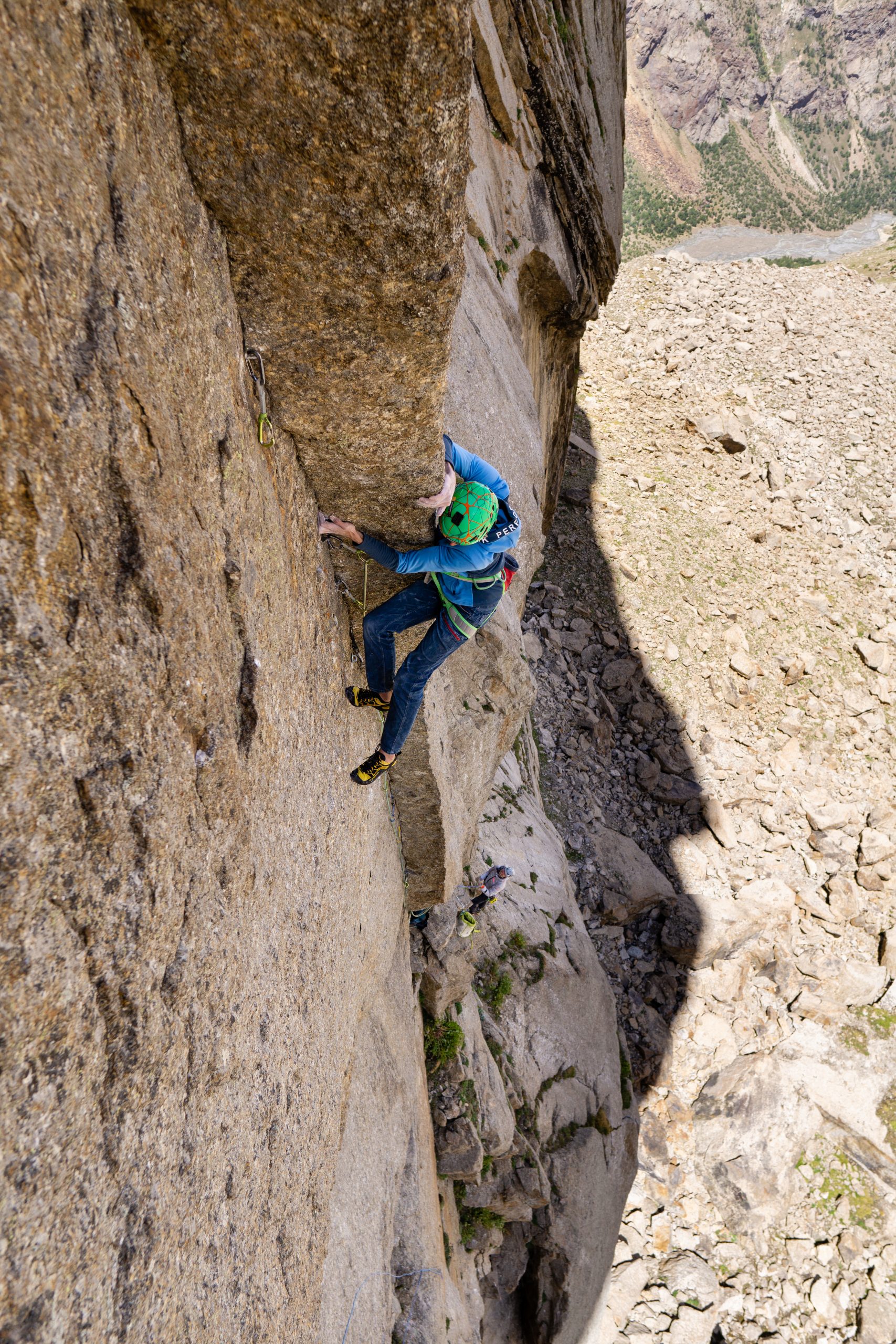 • Little hike in the valley to inspect some lines. Motz’s and Patrick’s current objective is a free climb attempt of the “Pugachev-Maksimenya”-Route on Asan because the line looked simply amazing. They also spotted a very promising crack between “Pugachev-Maksimenya” and “Alperina”. Obi and Hannes instead looked for a new line on the neighboring “Michael Volkov” Peak, to the right of the huge Asan west face.