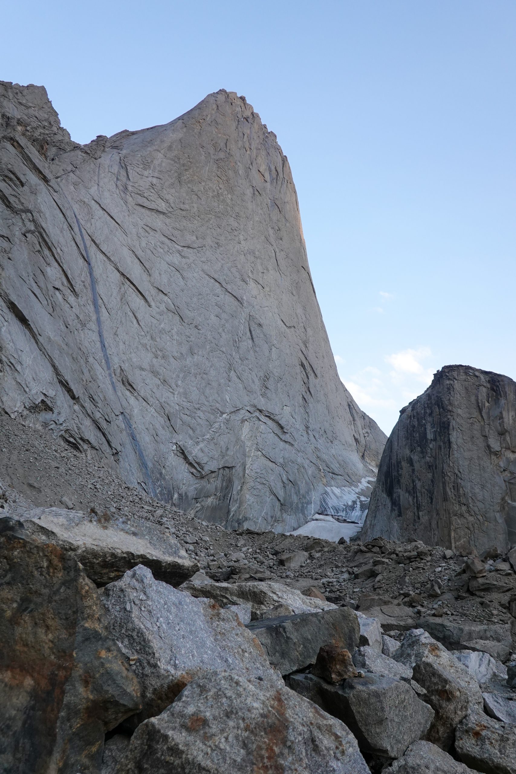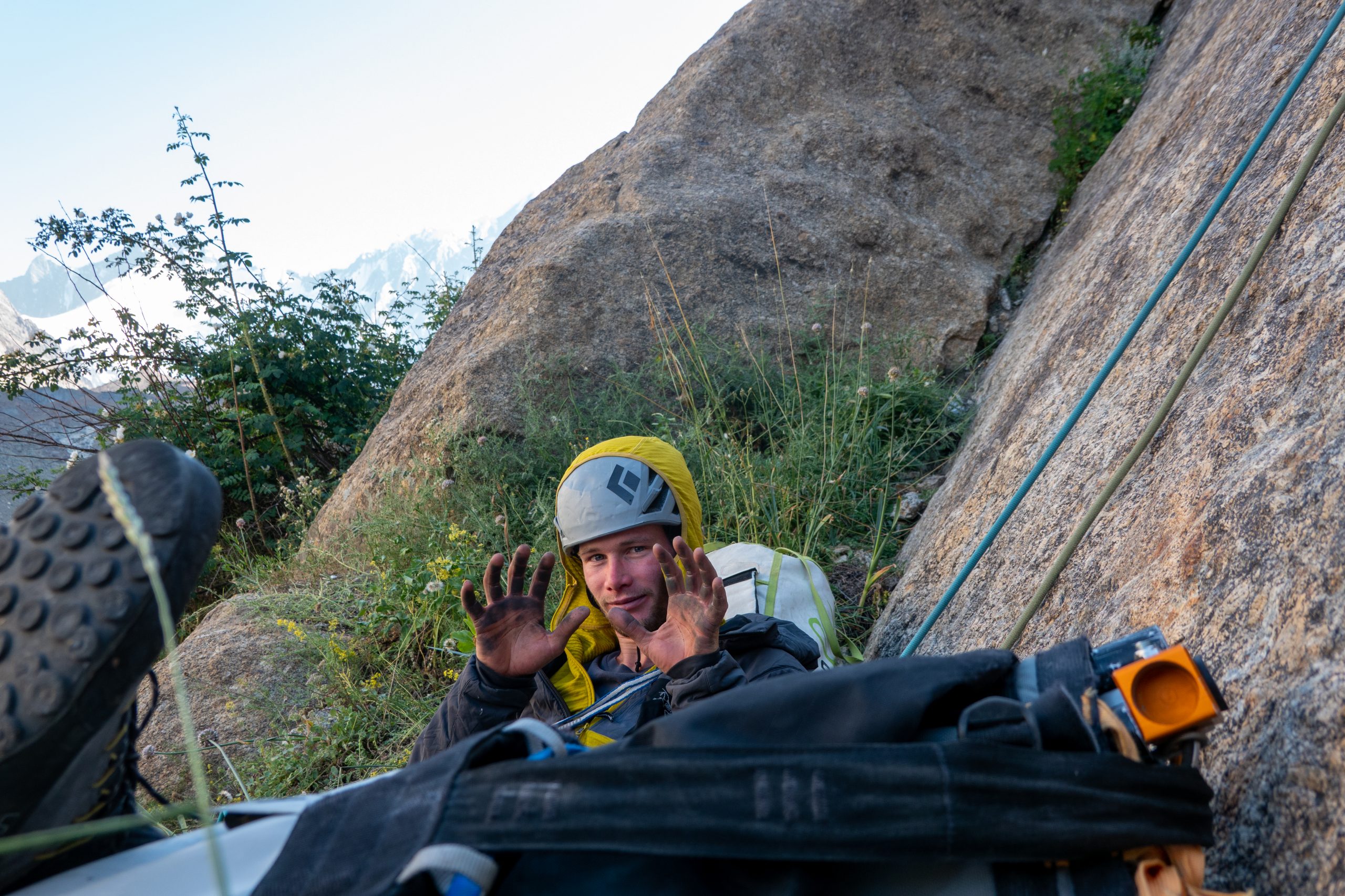 • Mo and Patrick left the Portaledge and all the bivy material behind and climbed into the headwall of the Yellow Wall. After four pitches, they reached the big flake. Their idea was to climb the flake and then take a pendulum to reach the “Commander Crack”. But the crack behind the flake was much wider than expected, and they had only one cam of size #6, which was not enough. They put three bolts under the flake, which still did not bring any breakthrough, so they decided to give up. They were physically and mentally exhausted and did not want to drill themselves through the whole flake. They rappelled over the route and hiked back to the Basecamp.