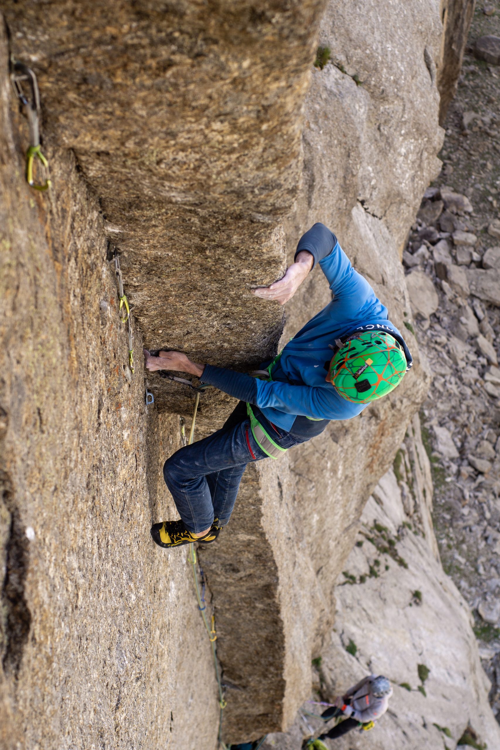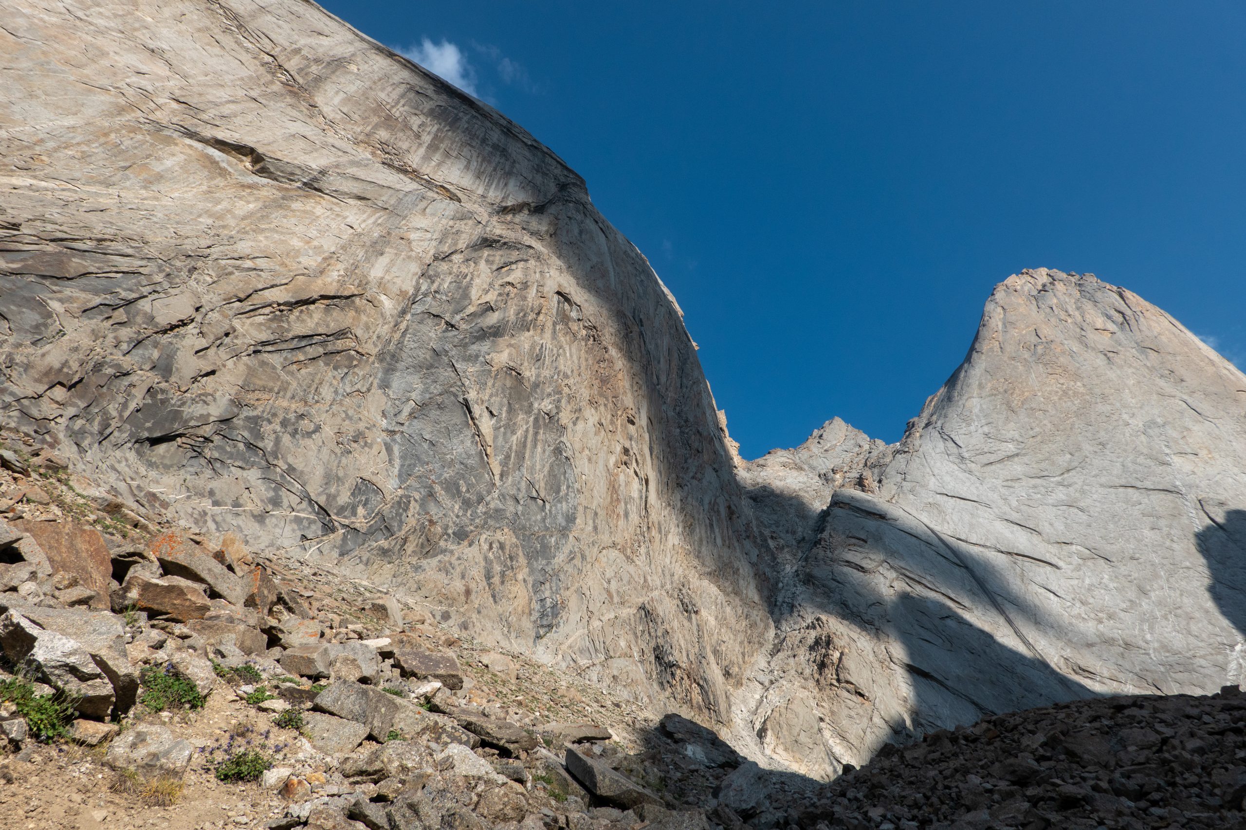 The line is very obvious and cannot be missed. The major part of the route is easy climbing, and there is only one harder pitch. The crux pitch (7a) is steep and felt very strenuous, especially because of the altitude (~3500 m). The descent on the backside of the mountain was very obvious and fast. Compared to the other walls, the rock quality is not as good, but the route is well suited as a warm-up route.