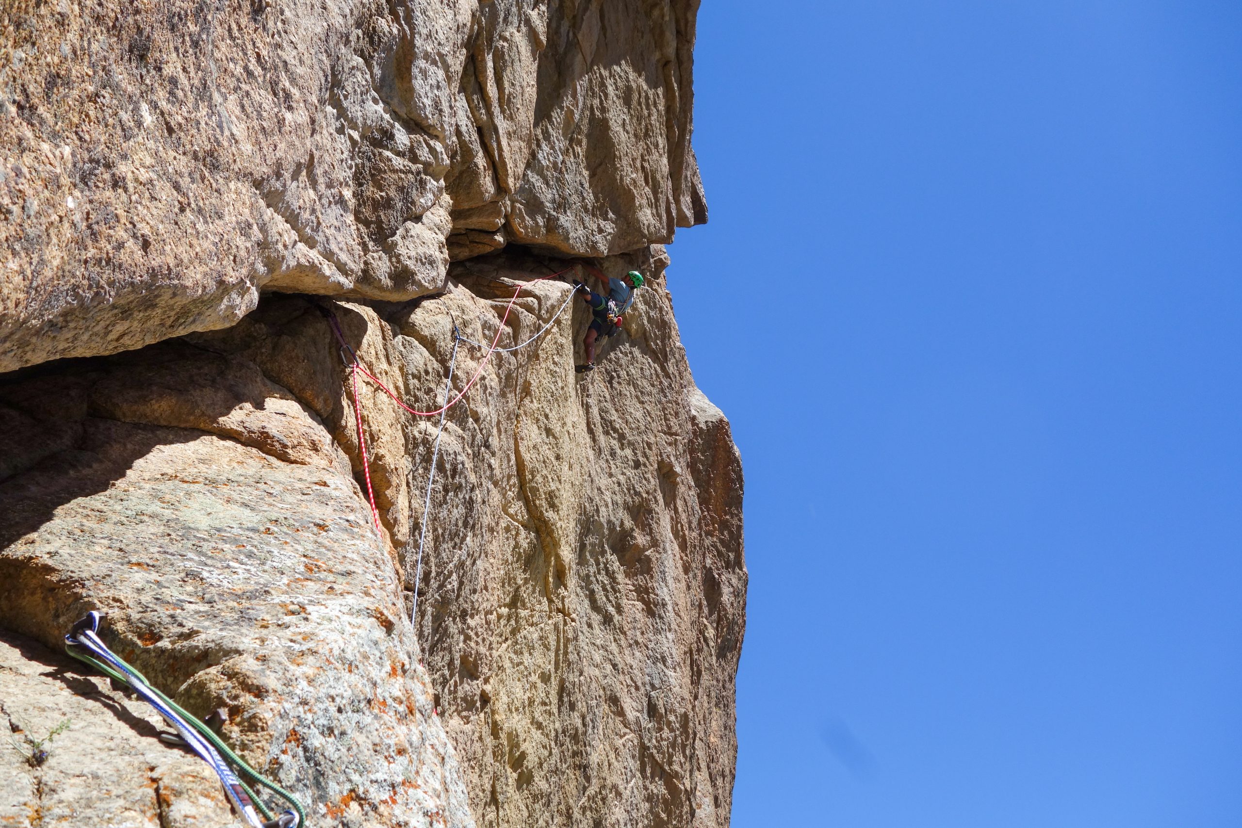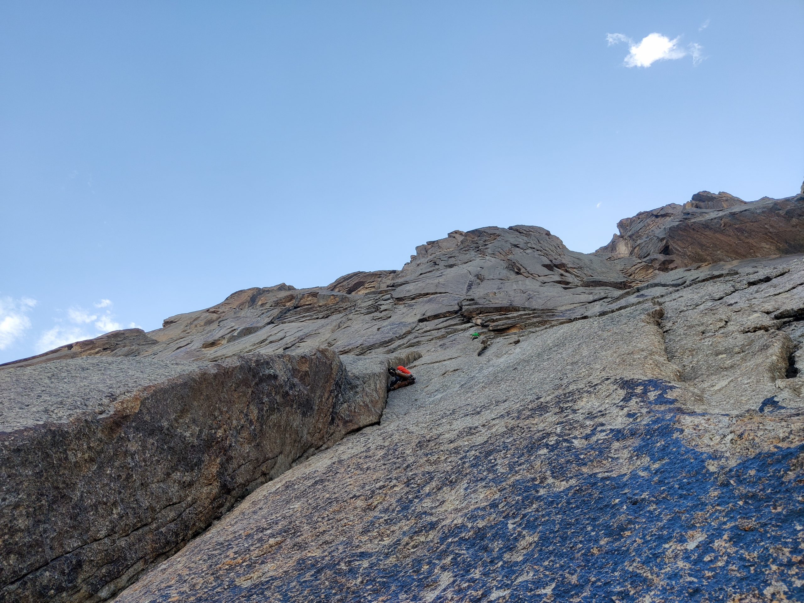 • Mo and Lisi wanted to give the Commander Crack another try. They aimed to traverse the blank slab to reach the promising crack on the old technical route, which Mo and Patrick spotted on their previous attempt. But some blank sections prevented them from reaching the crack.