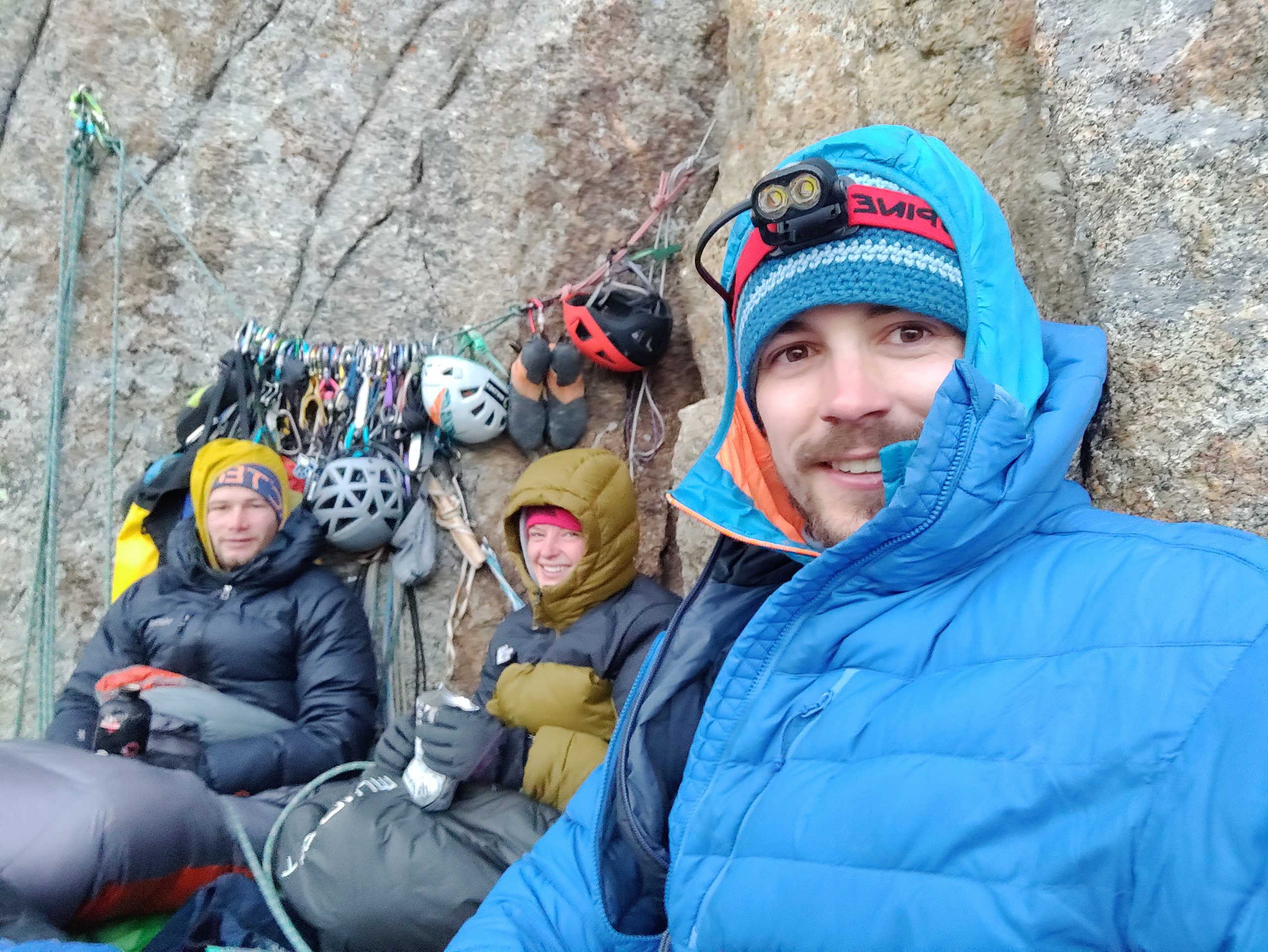 • Motz, Obi, Hannes and Lisi started a new attempt on Kotina. This time they avoided hauling, and all four climbed with a backpack, the leading person took a light backpack and the follower a heavier one with water and food. They discovered from the Russians that there is water (not always) on the ledge, which made the backpacks much lighter. After approximately 18-20 pitches with beautiful climbing, they arrived at the big ledge in the middle of the wall on sunset. On the ledge, there are two nice sleeping places and enough space, so they didn’t have to belay themselves overnight. Unfortunately, they forgot the lighter and so they could only eat lyofoods with cold water. Absolutely disgusting!