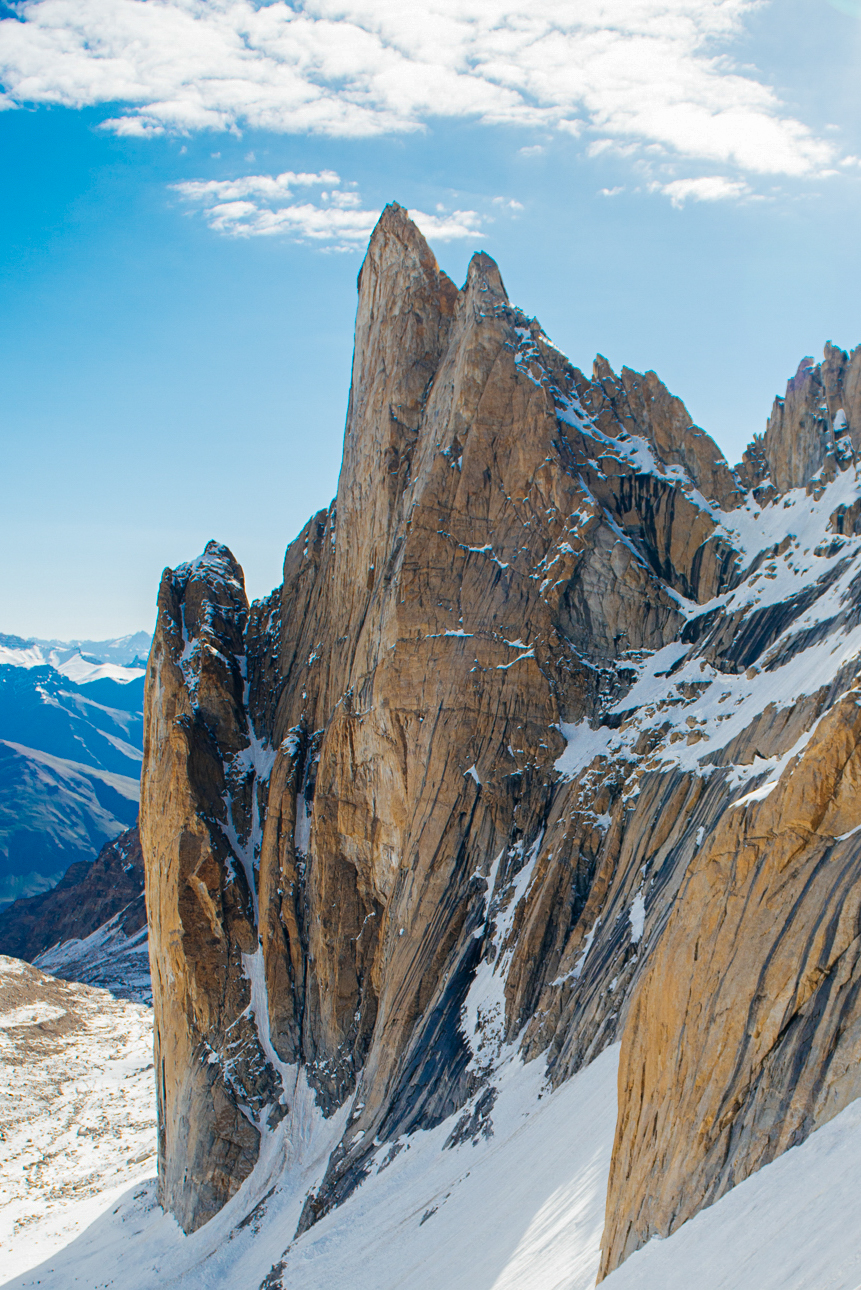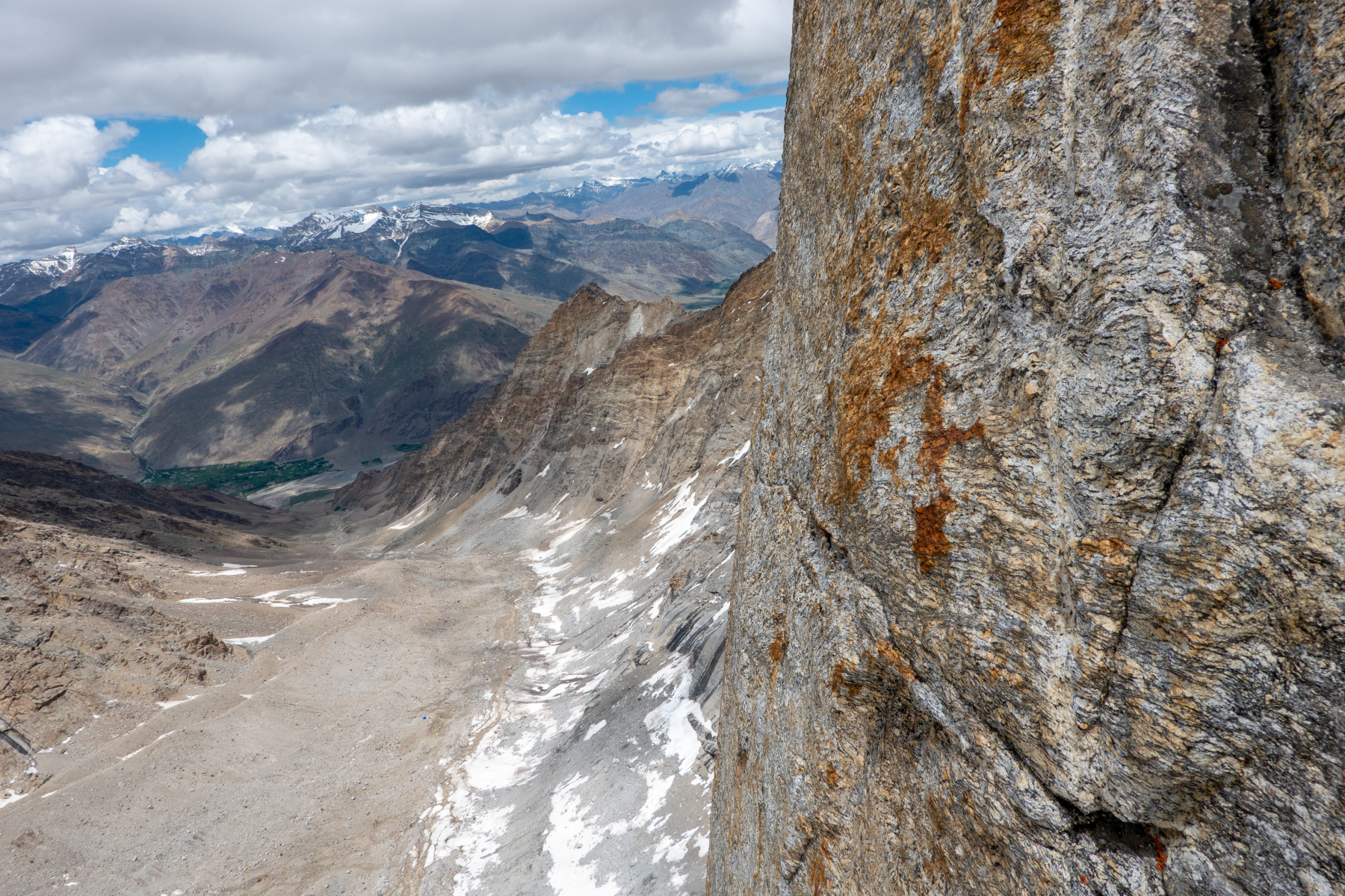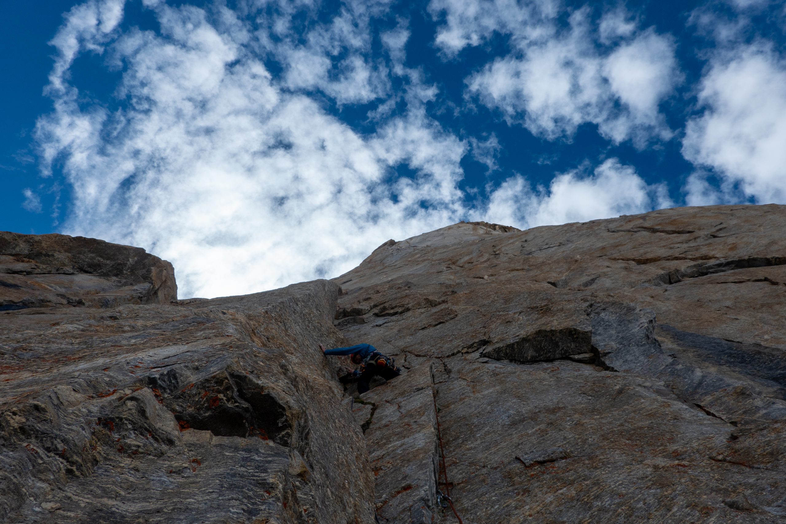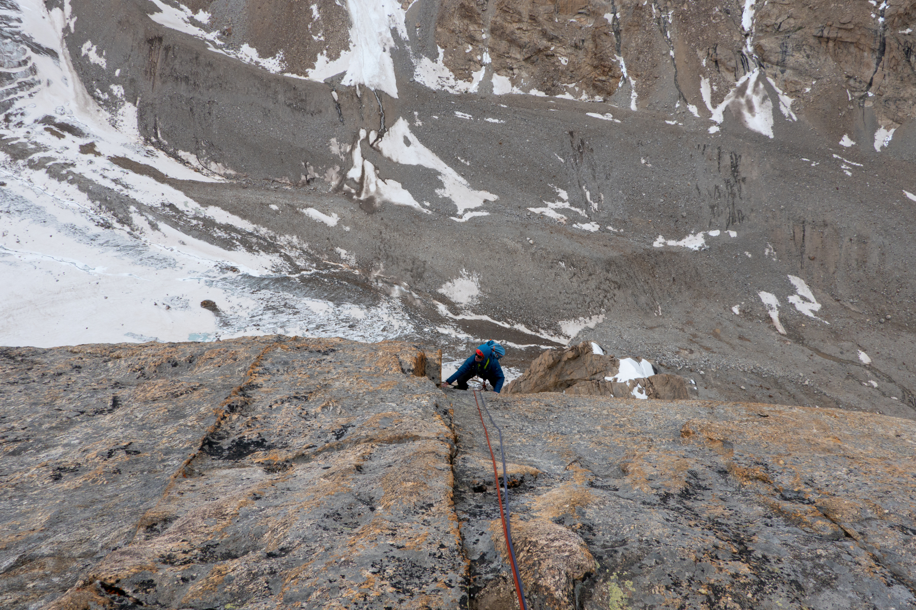 Für zwei Seillängen folgen wir einem dünnen Haarriss, den wir mit Keilen und kleinen Friends absichern. Die Kletterei ist absolut genial. Regelmäßig müssen wir unsere aufgeblasenen Arme an den Zwischensicherungen entlasten. Doch wir sind uns einig, dass wir uns gerade in den schönsten alpinen Seillängen befinden, die wir je gesehen haben. Der lokale Regenschauer, der sich plötzlich unweit von uns über dem Chanrasrik Ri entlädt, beunruhigt uns zwar extrem, doch unsere sprühende Motivation scheint den Regen von uns fernzuhalten.