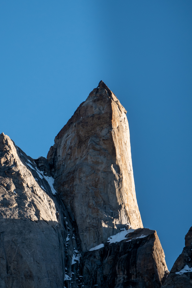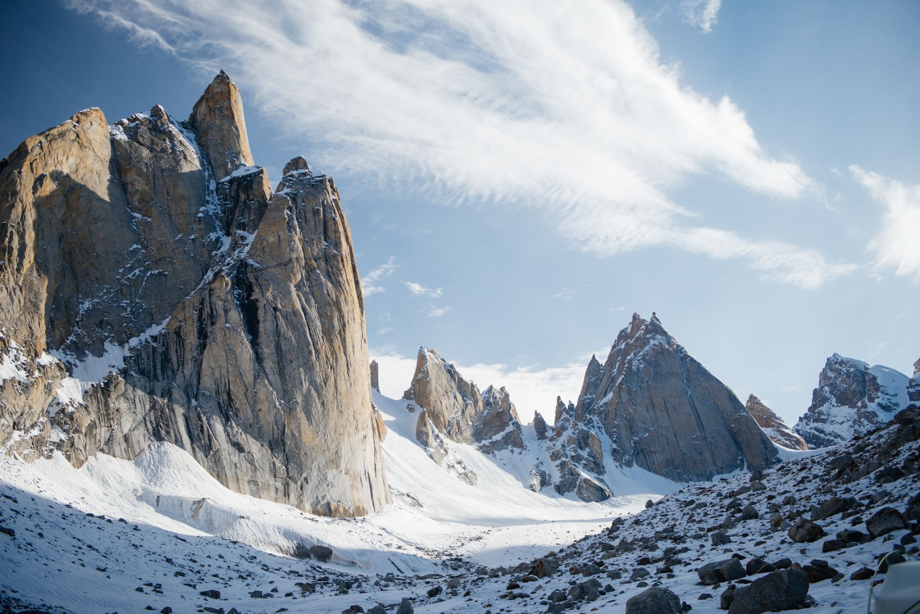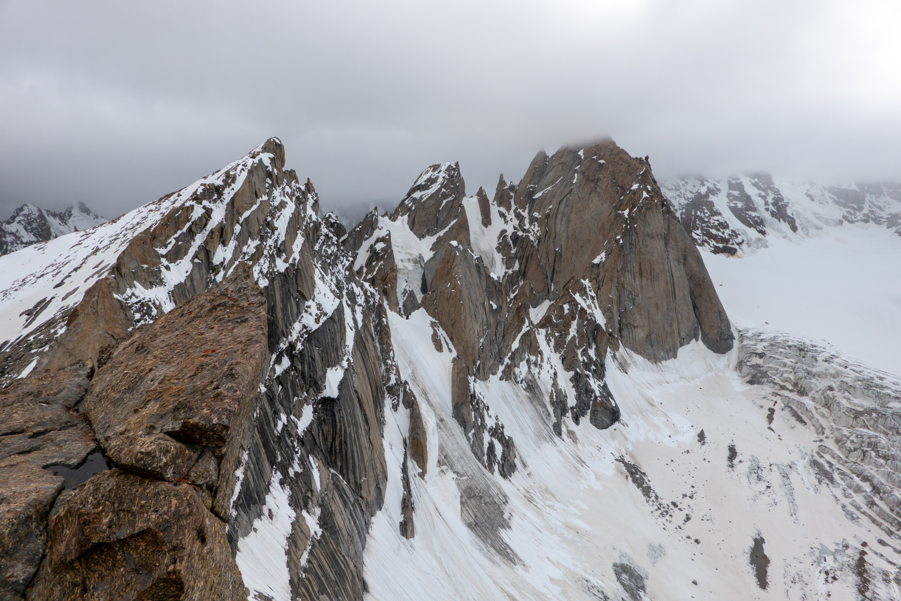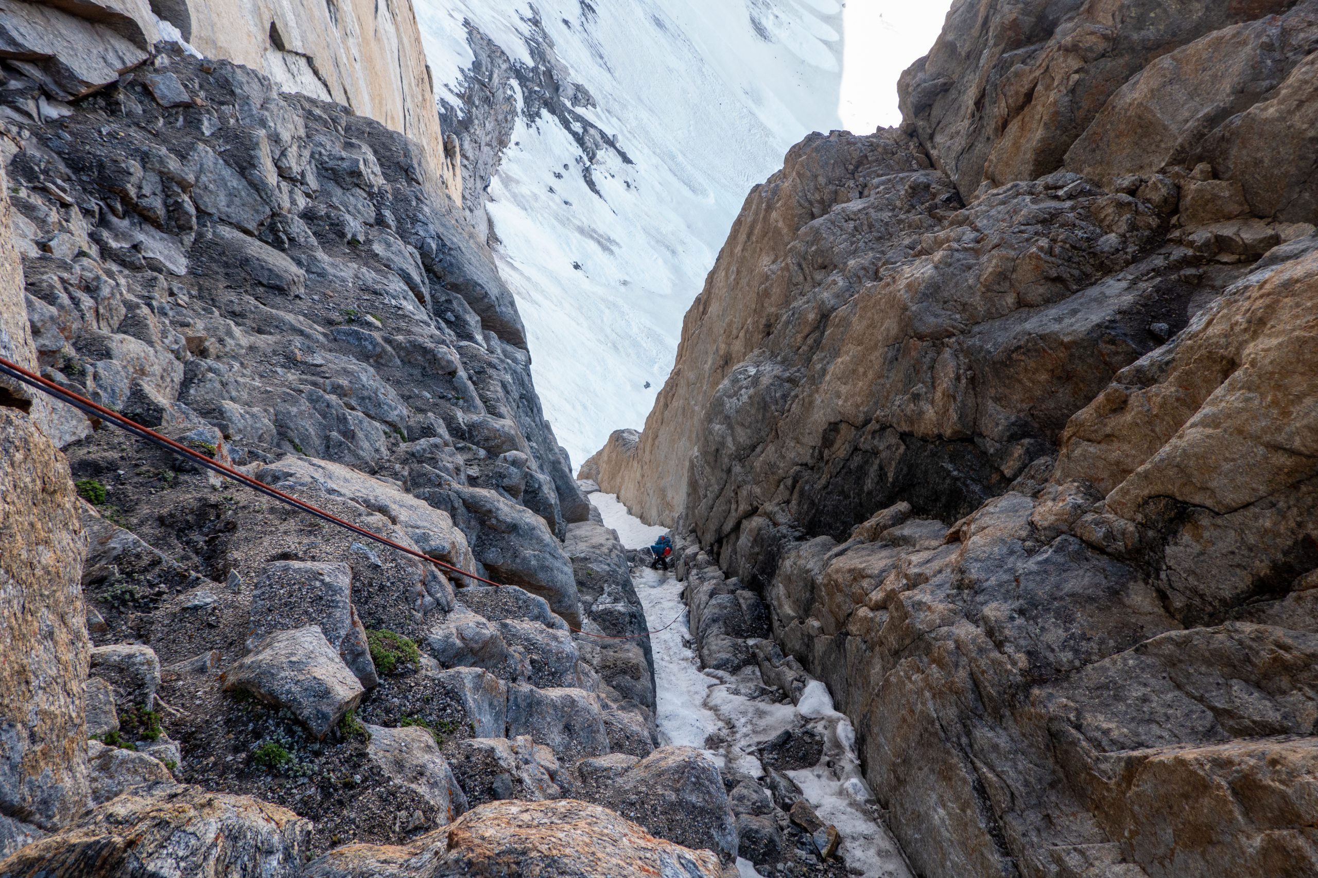 Da wir unseren ursprünglichen Plan, genau diese Kante durch die zentrale Wand des Vorgipfels zu erreichen, aufgeben mussten, entscheiden wir uns für den Kanal, der sich zwischen Haupt- und Vorgipfel bildet und bis zum Wandfuß reicht. Moritz und ich starten um 4 Uhr morgens vom Basislager aus, mit auf das Notwendigste reduzierte Material und einer guten Mischung aus Motivation, Hoffnung und Zuversicht.