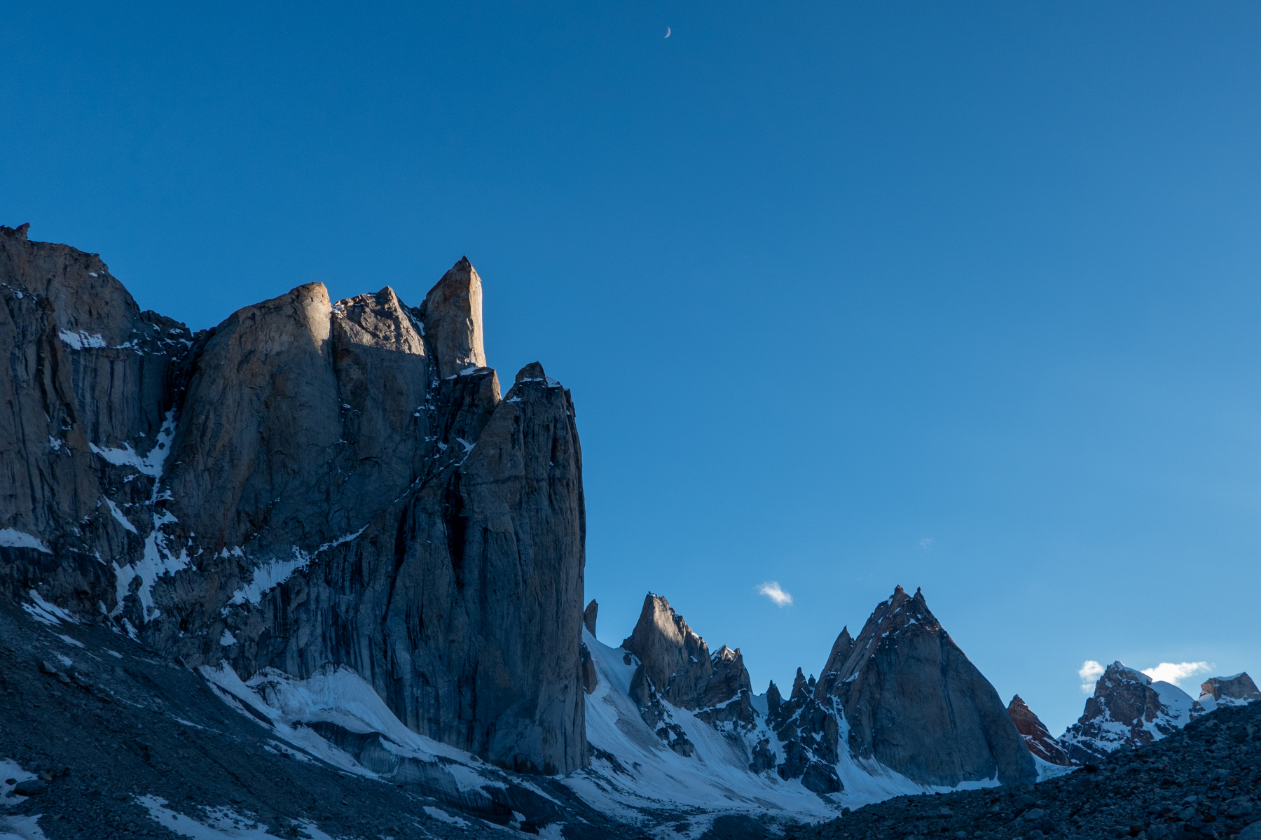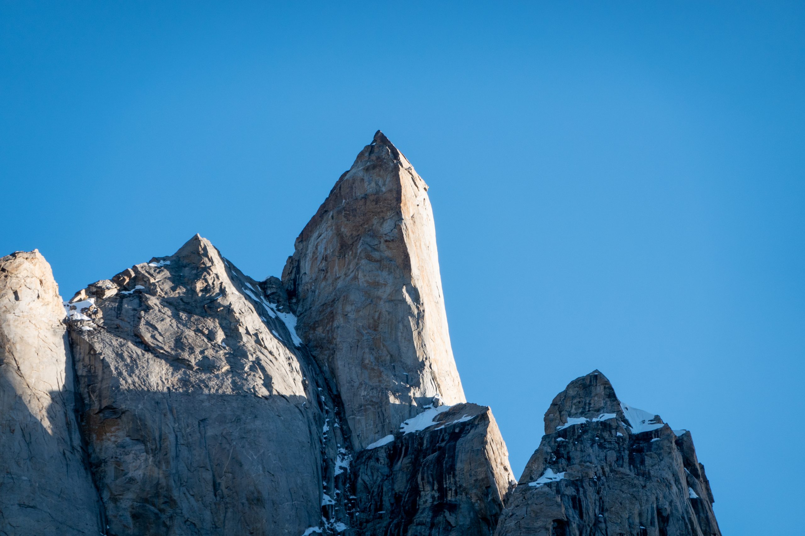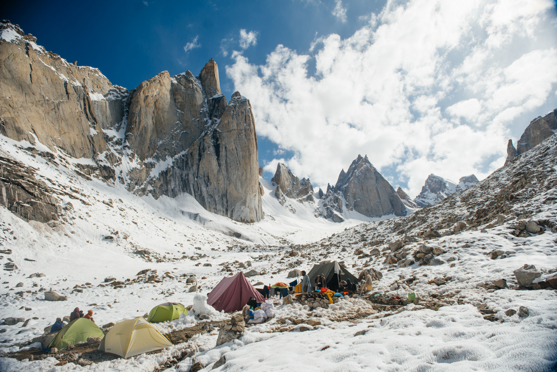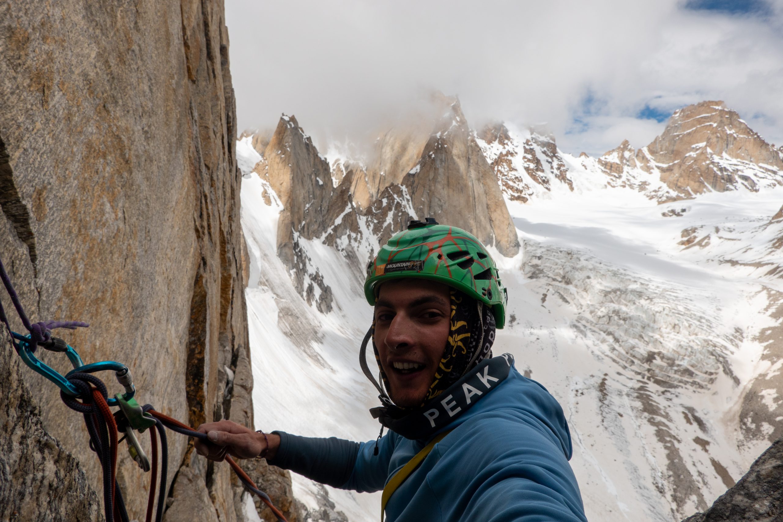 Da wir unseren ursprünglichen Plan, genau diese Kante durch die zentrale Wand des Vorgipfels zu erreichen, aufgeben mussten, entscheiden wir uns für den Kanal, der sich zwischen Haupt- und Vorgipfel bildet und bis zum Wandfuß reicht. Moritz und ich starten um 4 Uhr morgens vom Basislager aus, mit auf das Notwendigste reduzierte Material und einer guten Mischung aus Motivation, Hoffnung und Zuversicht.
