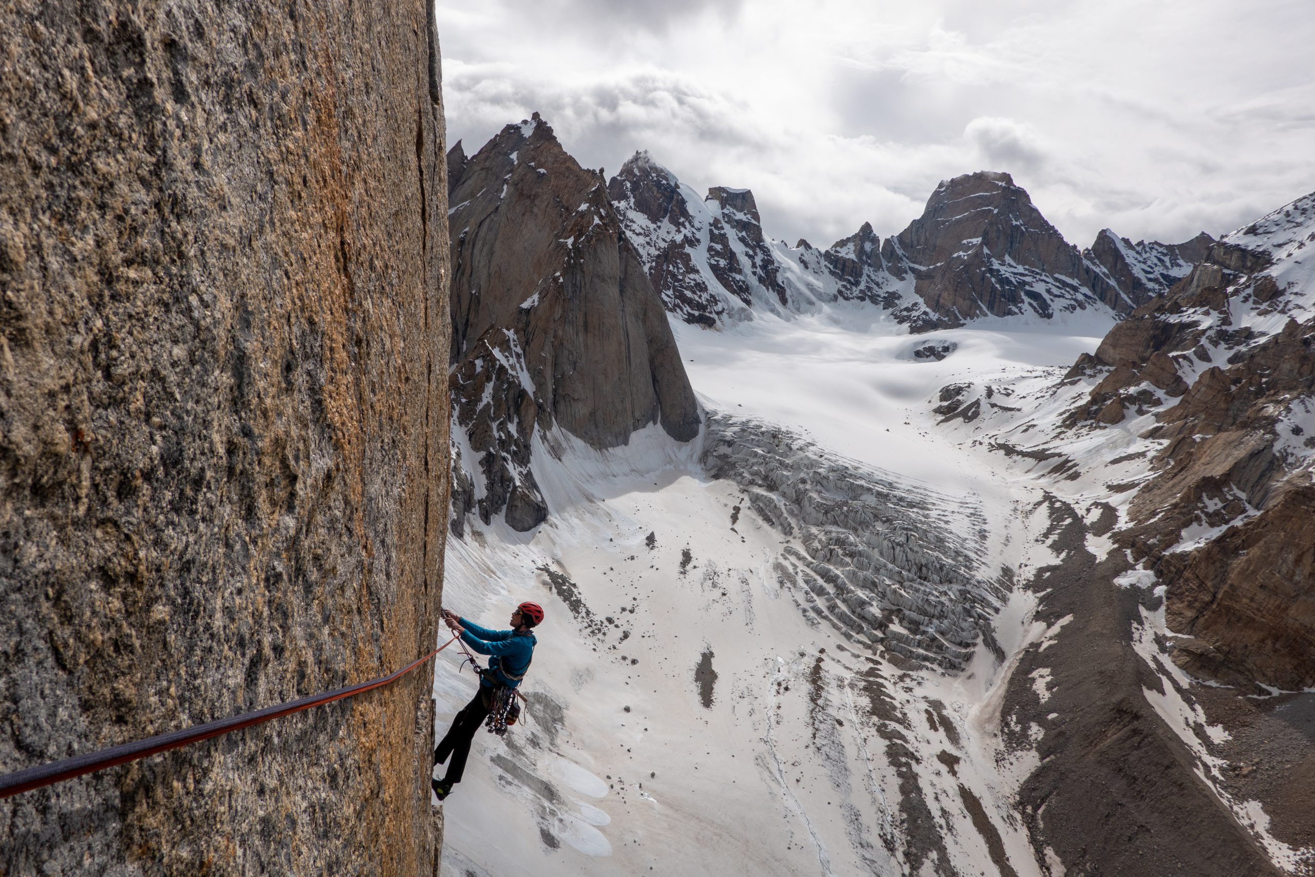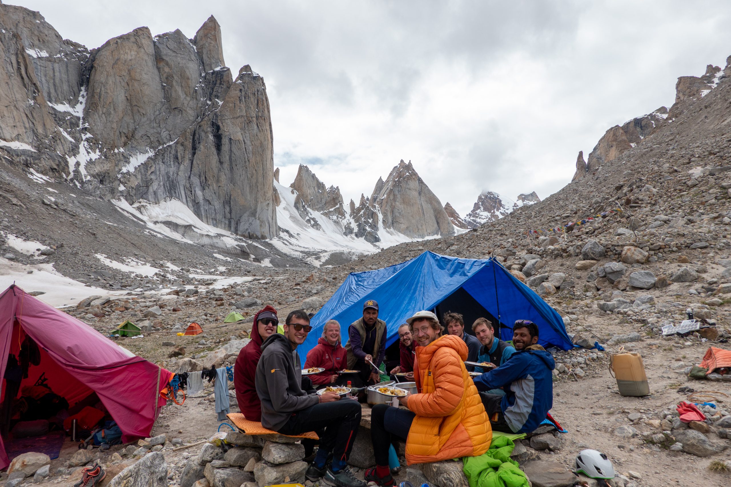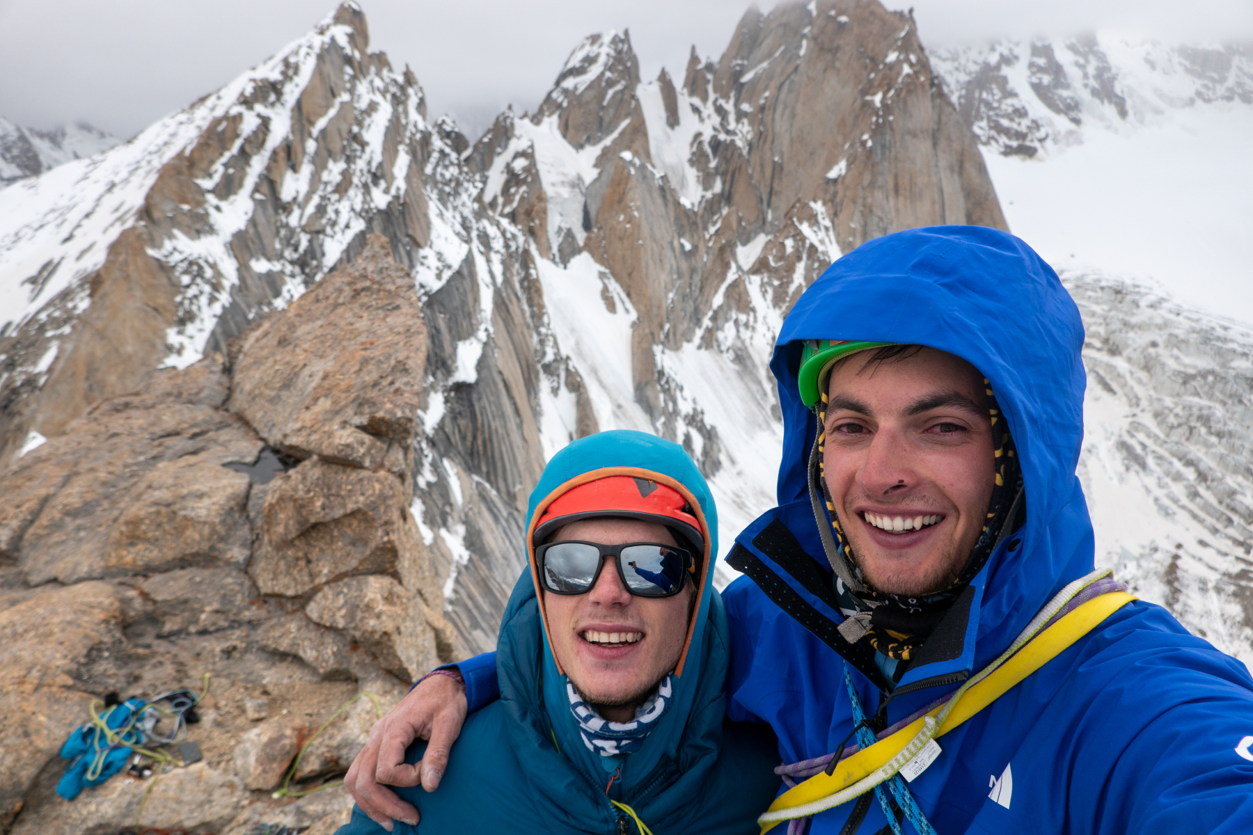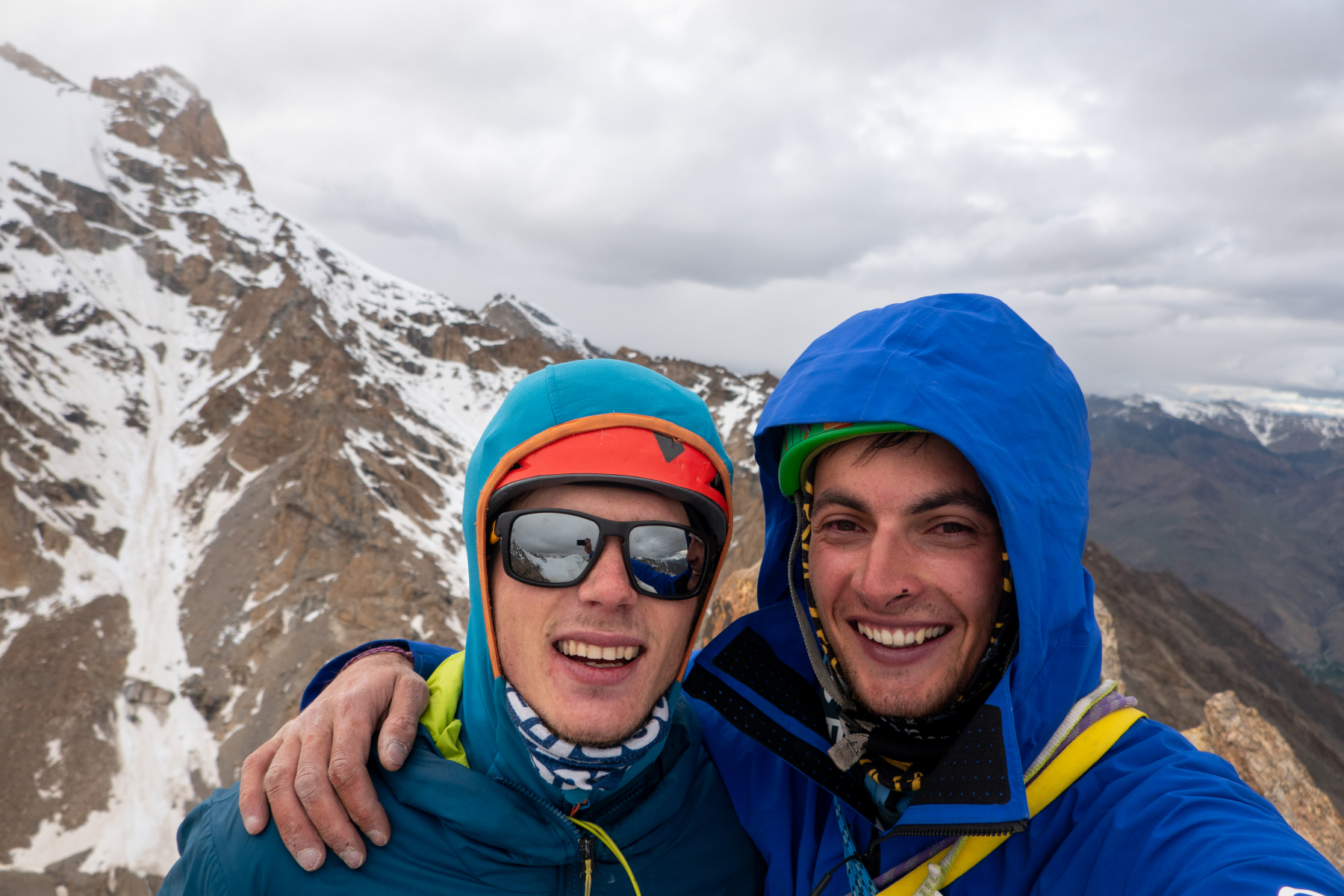 Ungeachtet all der Gipfelemotionen sind wir uns jedoch bewusst, dass wir uns als wahrscheinlich dritte Seilschaft an diesem Punkt auf 5800 Meter befinden und uns noch ein langer Abstieg bevorsteht. Mit nur spärlichen Informationen über die Abseilpiste der Slowenen machen wir uns auf dem Weg ins Basislager. Nach drei komplett senkrechten Abseilern hängen wir mitten in der Wand und finden den nächsten Abseilpunkt nicht. Wir sind gezwungen, die letzten Kräfte aus den ermüdeten Armen hervorzurufen und mit Hammer und Handbohrer einen Bohrhaken zu bohren. Nach dieser mühsamen und nervigen Arbeit finden wir wieder die Schlingen der Slowenen. Nach zwei weiteren Abseilern wird es dunkel und wir verlieren uns erneut. Per Funk informieren wir unsere Freunde, dass es noch etwas länger dauern könnte. Glücklicherweise finden wir nach jedem Abseiler genügend natürliche Felsstrukturen, die uns ein weiteres Abseilen ermöglichen. 18 Stunden nach Aufbruch erreichen wir das Basislager. Müde und erschöpft, aber unendlich glücklich.