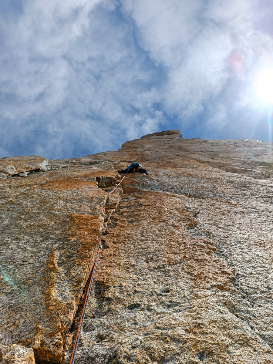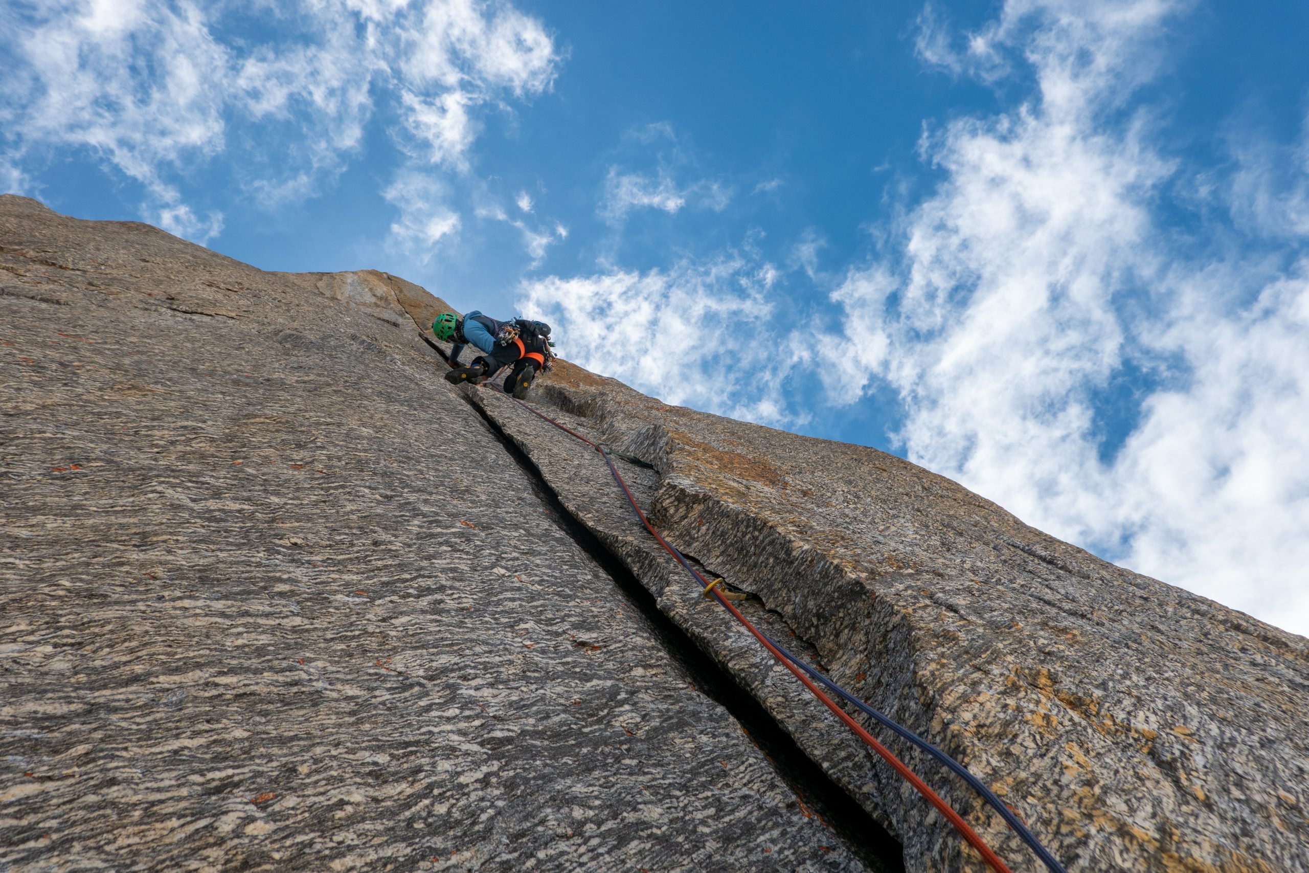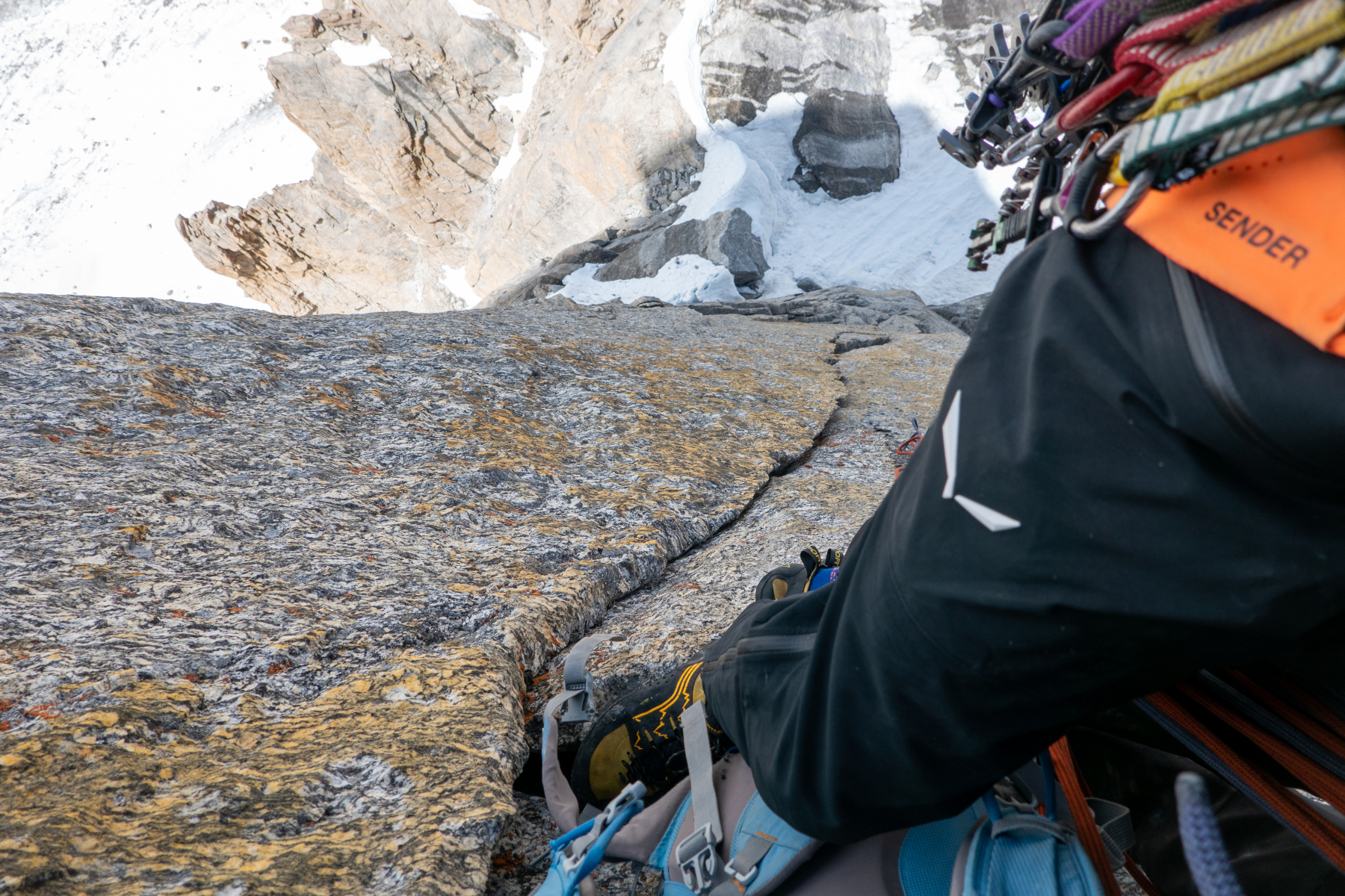Die erste Seillänge führt uns direkt auf die Kante des Bergkristalls und in einen Riss, den wir bereits vom Basislager aus sehen konnten. Dass sich dieser Riss als einer der schönsten alpinen Risse, die wir je geklettert sind, herausstellt, hätten wir uns in unseren besten Träumen nicht vorstellen können. Ganze zwei Seillängen können wir dieses Glück genießen.