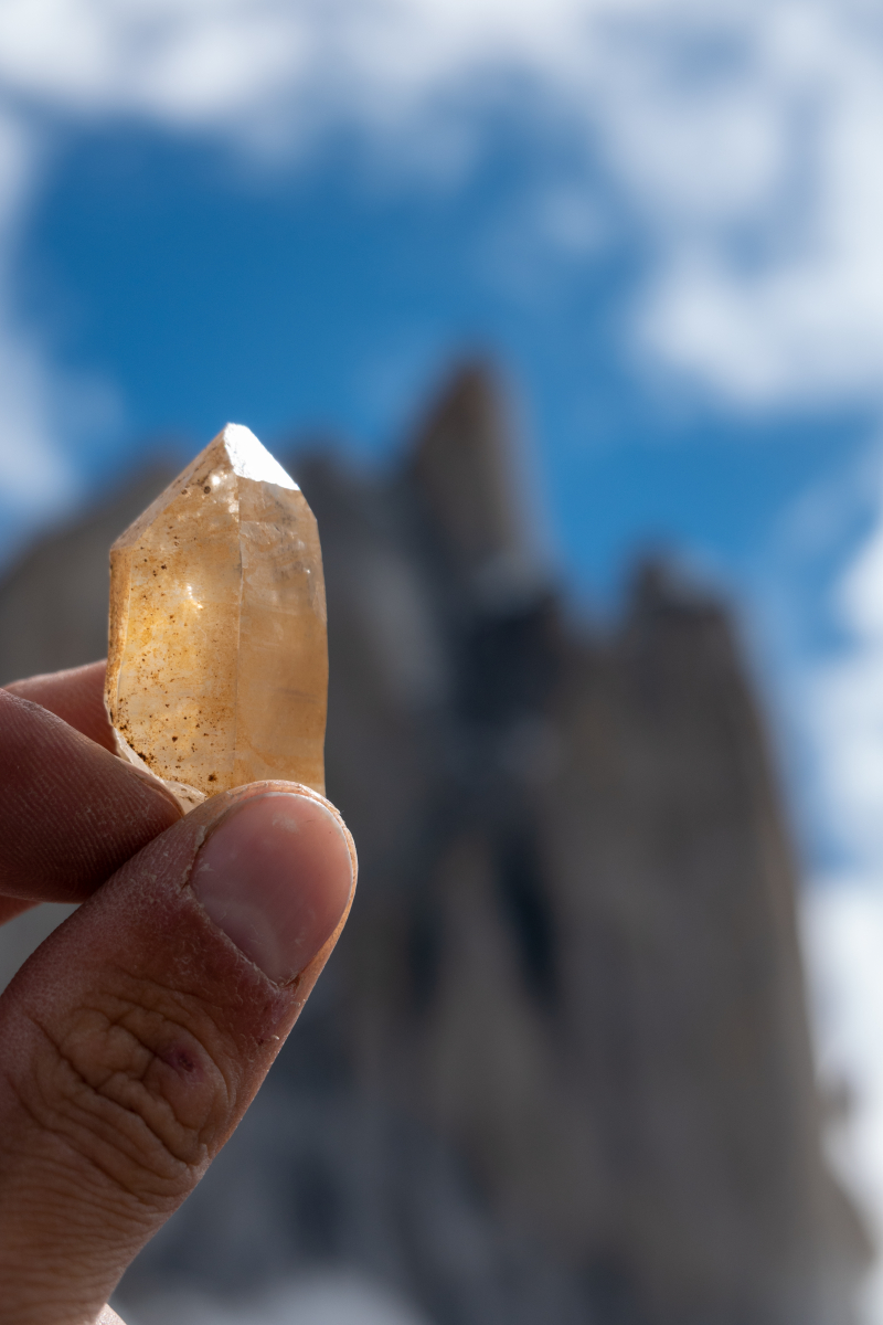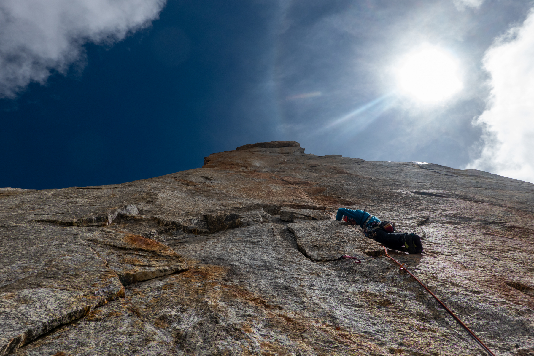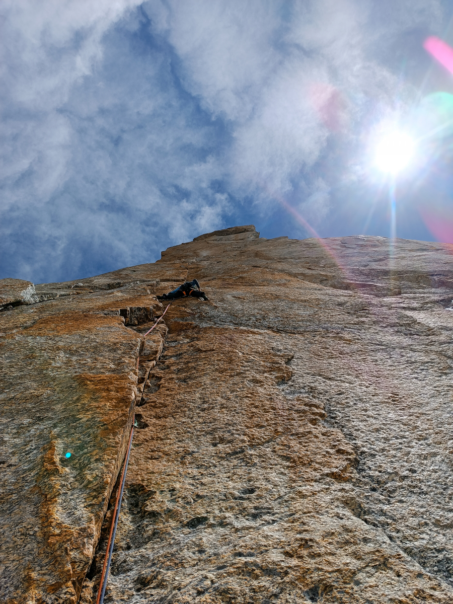 Die erste Seillänge führt uns direkt auf die Kante des Bergkristalls und in einen Riss, den wir bereits vom Basislager aus sehen konnten. Dass sich dieser Riss als einer der schönsten alpinen Risse, die wir je geklettert sind, herausstellt, hätten wir uns in unseren besten Träumen nicht vorstellen können. Ganze zwei Seillängen können wir dieses Glück genießen.