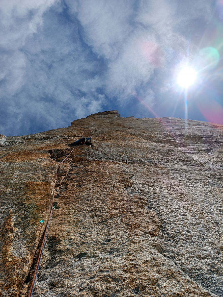 Nach diesen sehr intensiven Klettermetern komme ich, vollgepumpt mit Adrenalin, am Stand an.  Ein Schuldgefühl gegenüber den potentiellen Wiederholern unserer Route überkommt uns. „Die werden uns hassen!“. Doch Cliff haben wir keinen dabei und der Handbohrer mit den zwei Bohrhaken ist nur für einen erzwungenen Rückzug gedacht. Doch dafür hebt ein Blick in die Wand über uns, die sich inzwischen in der Nachmittagssonne Orange färbt, unsere Zuversicht, dass wir es doch noch auf den Gipfel schaffen könnten.