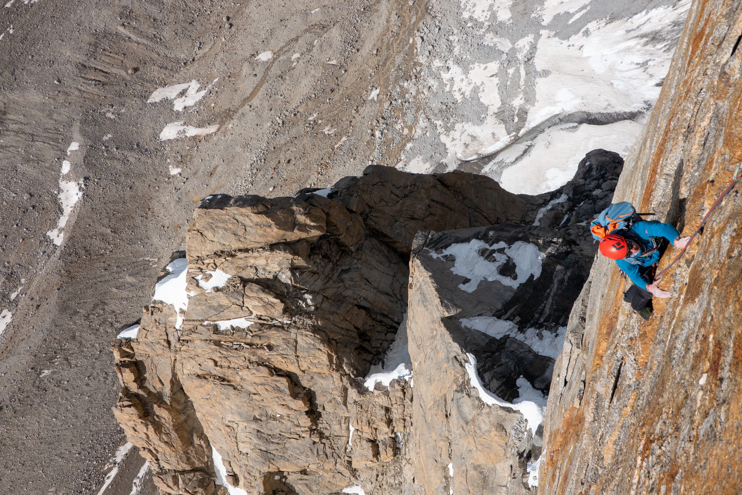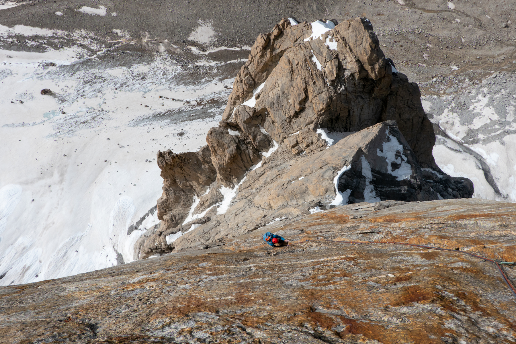 Die Frage, ob unsere Route in einer Sackgasse enden wird, scheint sich zu nähern. Kurz bevor der Riss in eine blanke Platte ausläuft, quert Moritz zwei Meter nach rechts, genau auf die Kante, und platziert dort einem Friend hinter einer schmalen Schuppe. Einen Kletterversuch gerade nach oben muss er nach wenigen Metern abbrechen, weil weit und breit keine Sicherungsmöglichkeit in Sicht ist. Zurück beim Friend erwägt er einen Wechsel auf die andere Seite des Bergkristalls über eine Quertraverse auf schmalen Leisten, nach dem er gute Griffe vermutet. Nach kurzem Zögern verschwindet er aus meinem Blickfeld. Langsam, aber konstant, läuft das Seil durch das Sicherungsgerät. Ab und zu höre ich sein Atmen durch den Wind. Auf meine Rufe reagiert er nicht. Ich werde etwas beunruhigt, doch ich ahne bei Weitem nicht, in welchem mentalen Kampf sich mein langjährigen Kletterpartner gerade befindet. Nach etwa zehn Minuten höre ich eine kraftlose Stimme: „Das war zu viel für meinen Kopf“. Die Bedeutung dieser Aussage wird mir erst bewusst, als ich im Nachstieg an der Kante bei dem Friend stehe. Ich sehe Moritz auf gleicher Höhe in einer senkrechten Wand in einem Hängestand auf zwei Keilen und zwei Friends hängen. Etwa sieben Meter von mir entfernt. Keine Sicherung dazwischen. Ich sehe seine Magnesiumspuren auf kleinen abschüssigen Griffen und zu meinem Erschrecken überhaupt keine Tritte. „Die ersten Züge musste ich hangeln, dann konnte ich einige Reibungstritte ansteigen“, sagt er mir. Da wo er gute Griffe vermutete, waren keine, und ein Zurückklettern war für ihn nicht mehr möglich. Mit dem beunruhigenden Wissen, welche Leistungen Moritz an den Felsen bringen kann, klettere ich los und stecke eine Kraft in meinen Fingern, dich ich wohl in kaum einer Sportkletteroute je zuvor hervorrufen konnte. Ein drohender Pendelsturz direkt in den Stand kann unglaubliche Kräfte beschwören.
