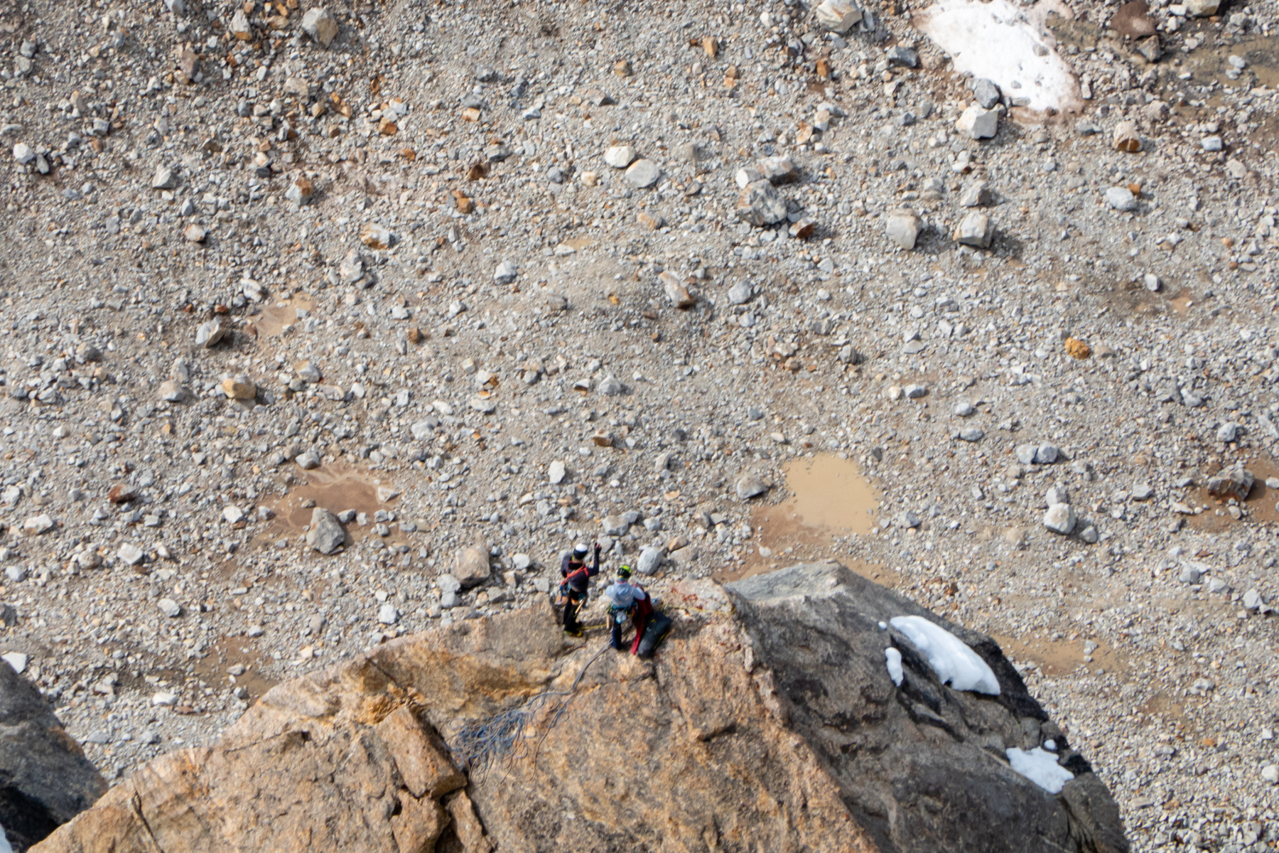 Nach einer weiteren Seillänge bemerken wir mit großer Freude, dass unsere Freunde Lisi und Makke unter uns den Vorgipfel des Jamyang Ri erreicht haben und somit ihre siebentägige Erstbegehung vollendet haben. Ich habe sie vor einigen Tagen begleitet und ihnen beim Haulen und Aufstellen des Portaledge geholfen. Deshalb weiß ich nur zu gut, welche grandiose alpinistische Leistung sie da vollbracht haben.