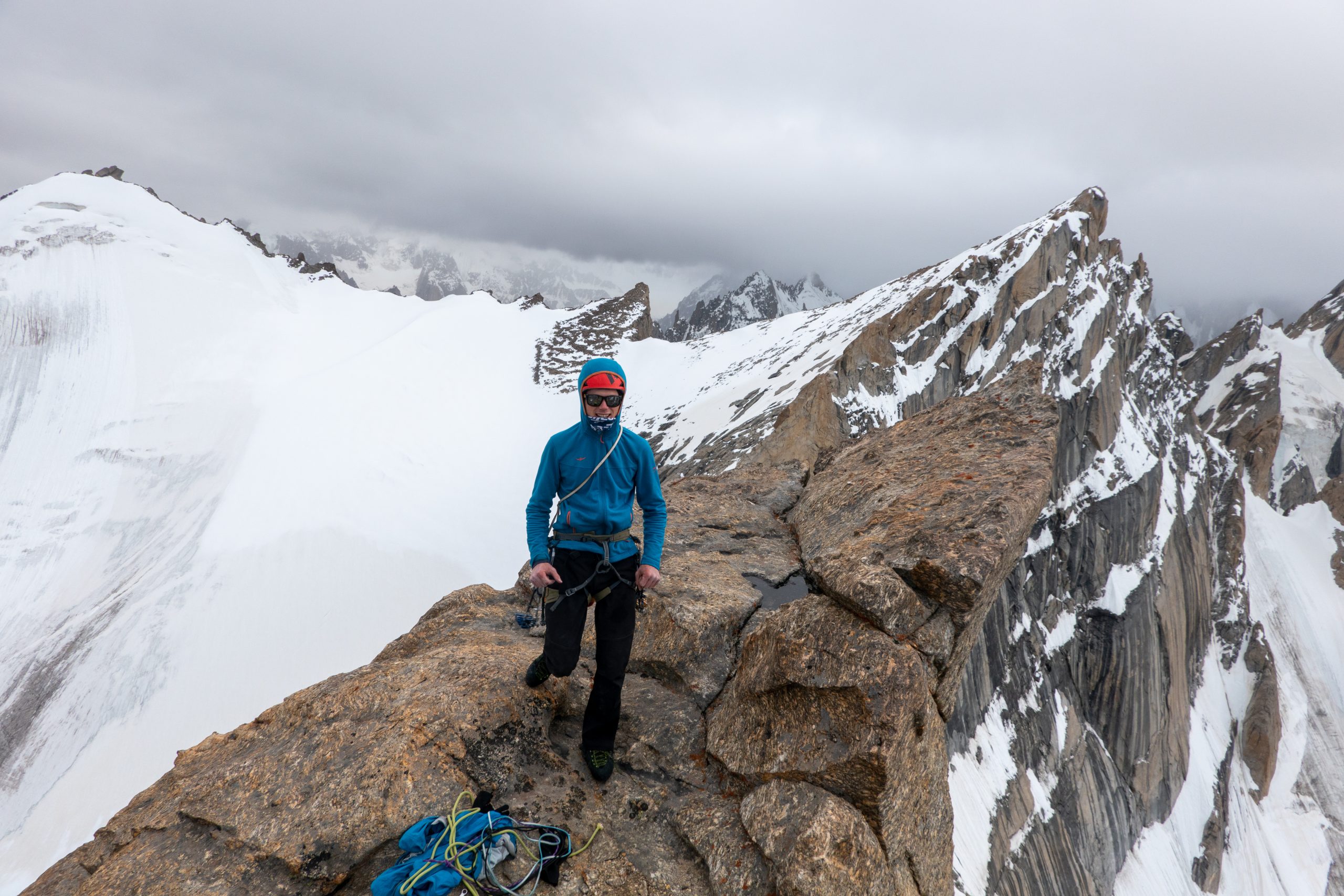 In den nächsten Seillängen zieht ein weiterer Regenschauer auf. Doch Buddha scheint es heute gut mit uns zu meinen und verschont uns erneut bis auf einige einzelne Tropfen. Ich hole meine letzten Kräfte aus mir heraus und renne gefühlt dem Gipfel entgegen. Meine Lungen arbeiten auf Hochtouren, um den niedrigen Sauerstoffgehalt der Luft auszugleichen. Sobald ich den Gipfel erreiche, kann ich nur mit Mühe meine Tränen zurückhalten. Unser erster Gipfel dieser Reise. Noch dazu eine Erstbegehung, deren Erfolg wir uns kaum erwartet hätten, und eine Linie, die uns im ganzen Tal am meisten inspiriert hatte. Nur zwei Schlaghaken haben wir benötigt und keinen einzigen Bohrhaken. Als wäre das nicht genug, befeuert uns die Aussicht auf die umliegenden Gletscher und Berge mit unglaublichen Impressionen.